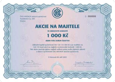 Nabízíme návrh a tisk akcií na míru pro různé účely a s širokou škálou ochranných prvků. Máme za sebou již nepřeberné množství realizací cenných papírů včetně dluhopisů, obligací a vkladních listů.